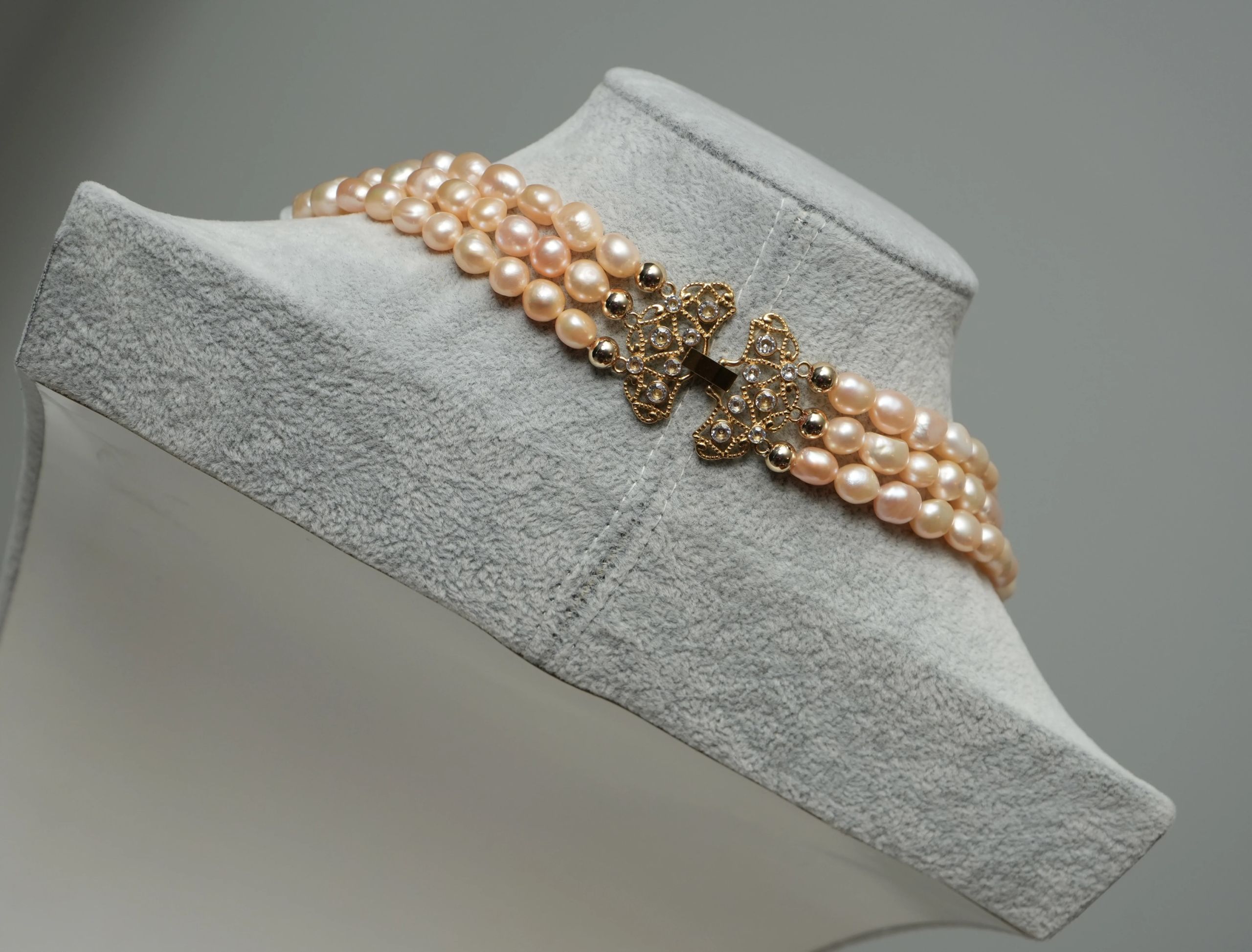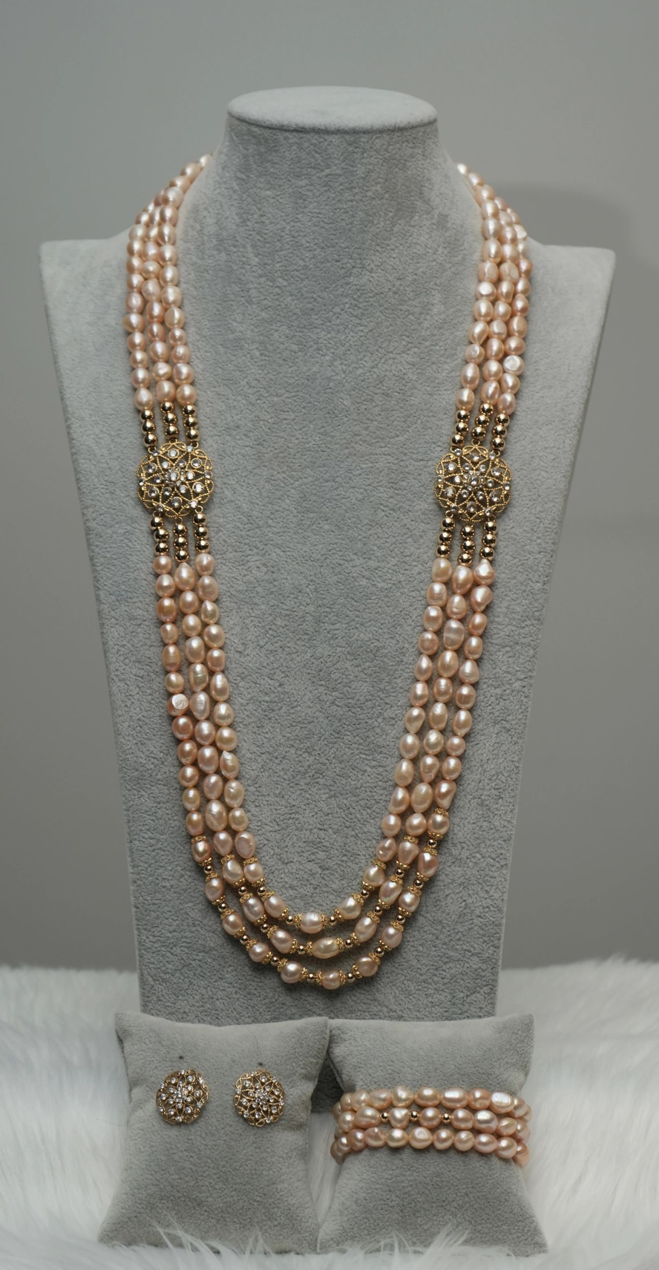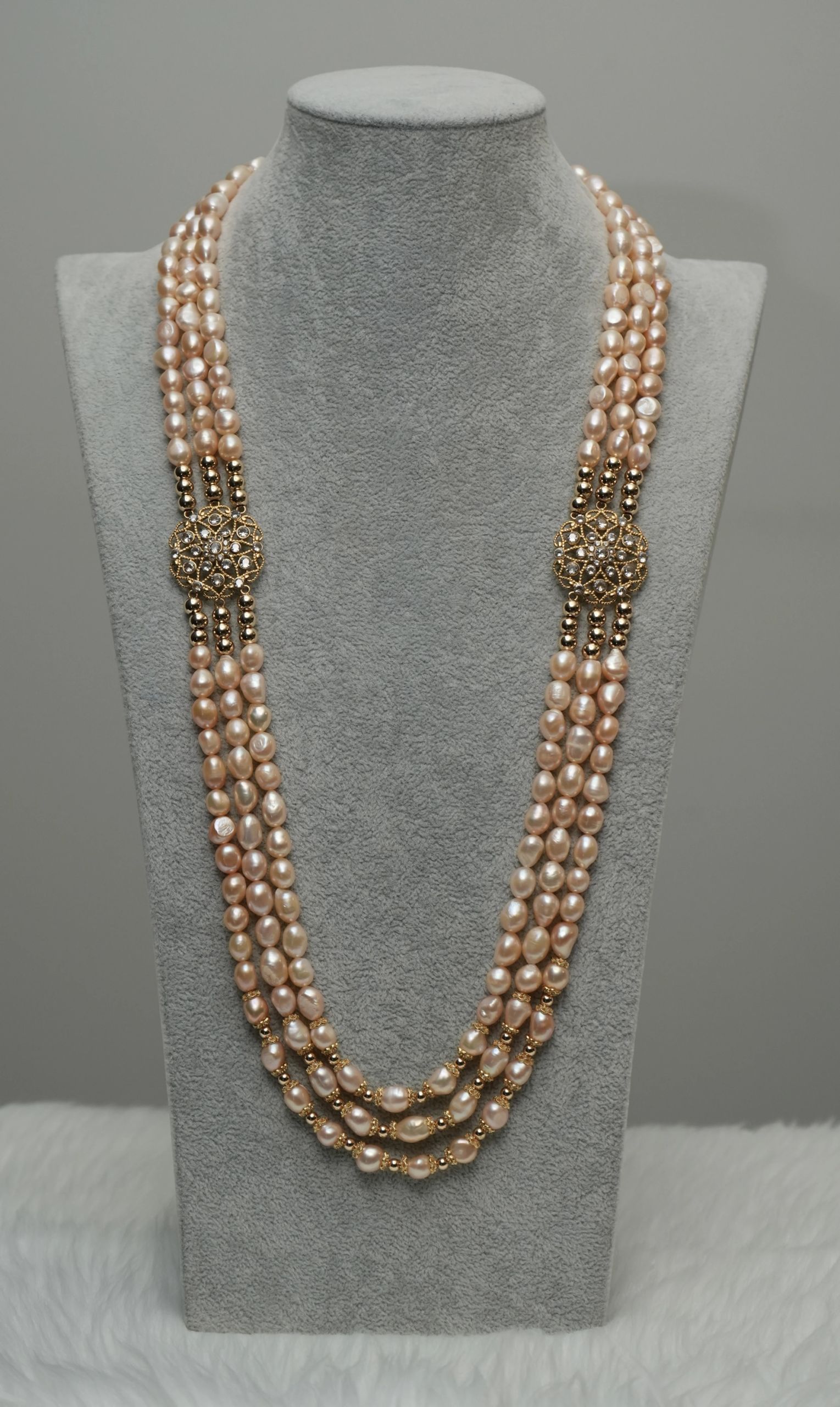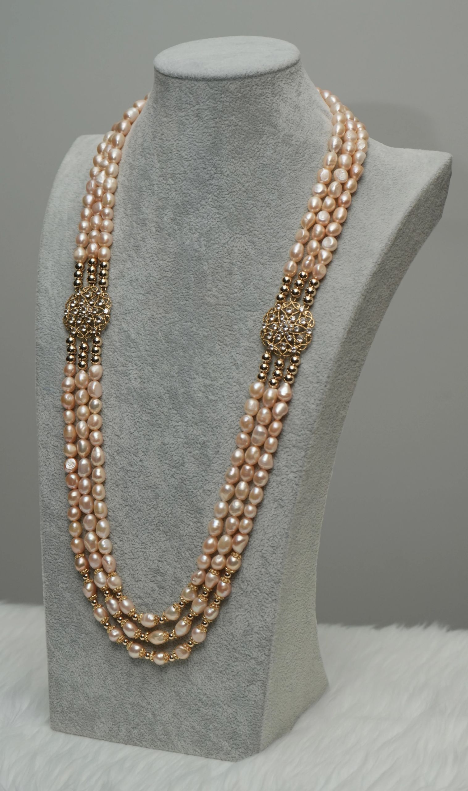 Radiance meets elegance in this 3-layered gold-colored freshwater pearl necklace, beautifully accented with two side pendants crafted in shimmering gold and encrusted with sparkling zirconia stones. The golden glow is further enhanced by lustrous gold balls, creating a look that is both timeless and strikingly modern.